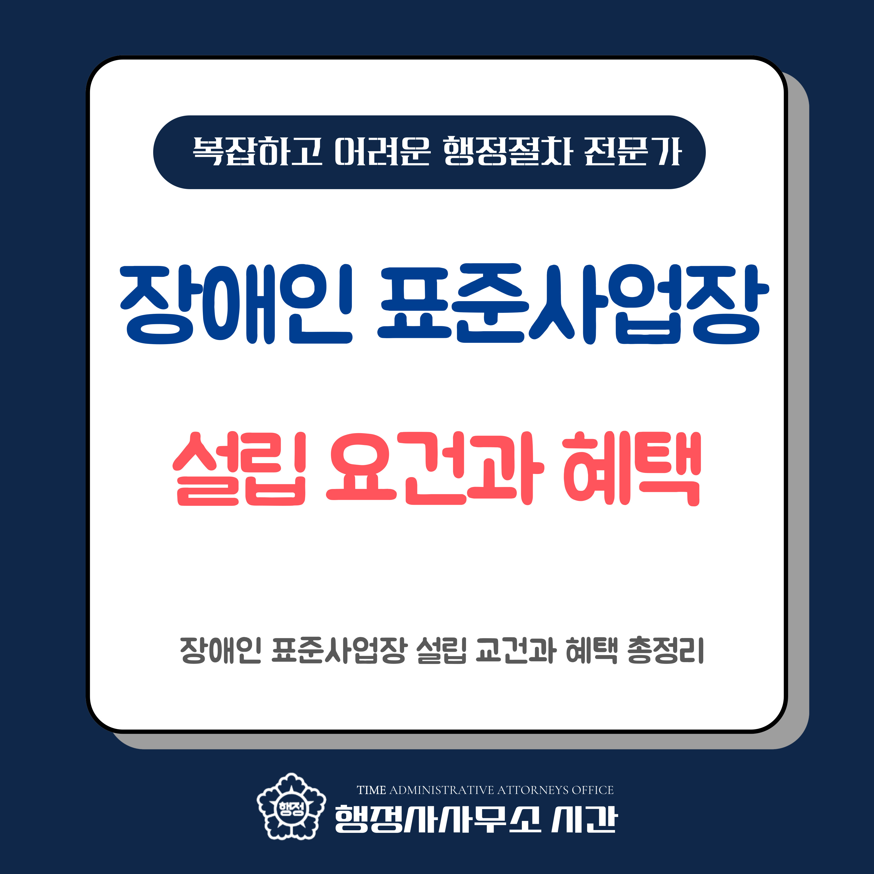 복잡한 설립 절차와 지원금 신청, 혼자 고민하지 마십시오. 행정사사무소 시간의 김영수 행정사가 성공적인 표준사업장 설립의 길을 열어드리겠습니다.